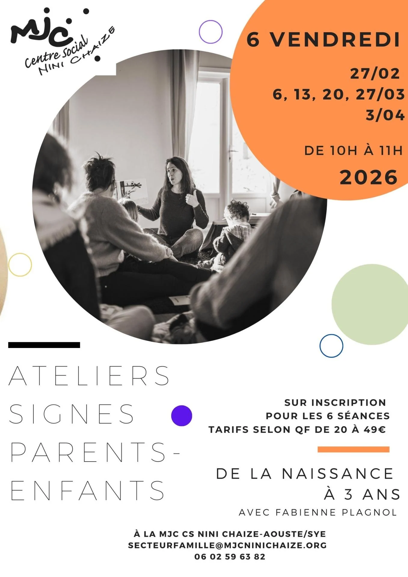 6 ateliers "signes" parents-enfants (0-3 ans) les vendredis de 10 à 11h, à la MJC CS Nini Chaize, 1re date le 27/02. Tarif entre 20 et 49€ selon QF. Infos et inscription: secteurfamille@mjcninichaize.org ou 0602596382