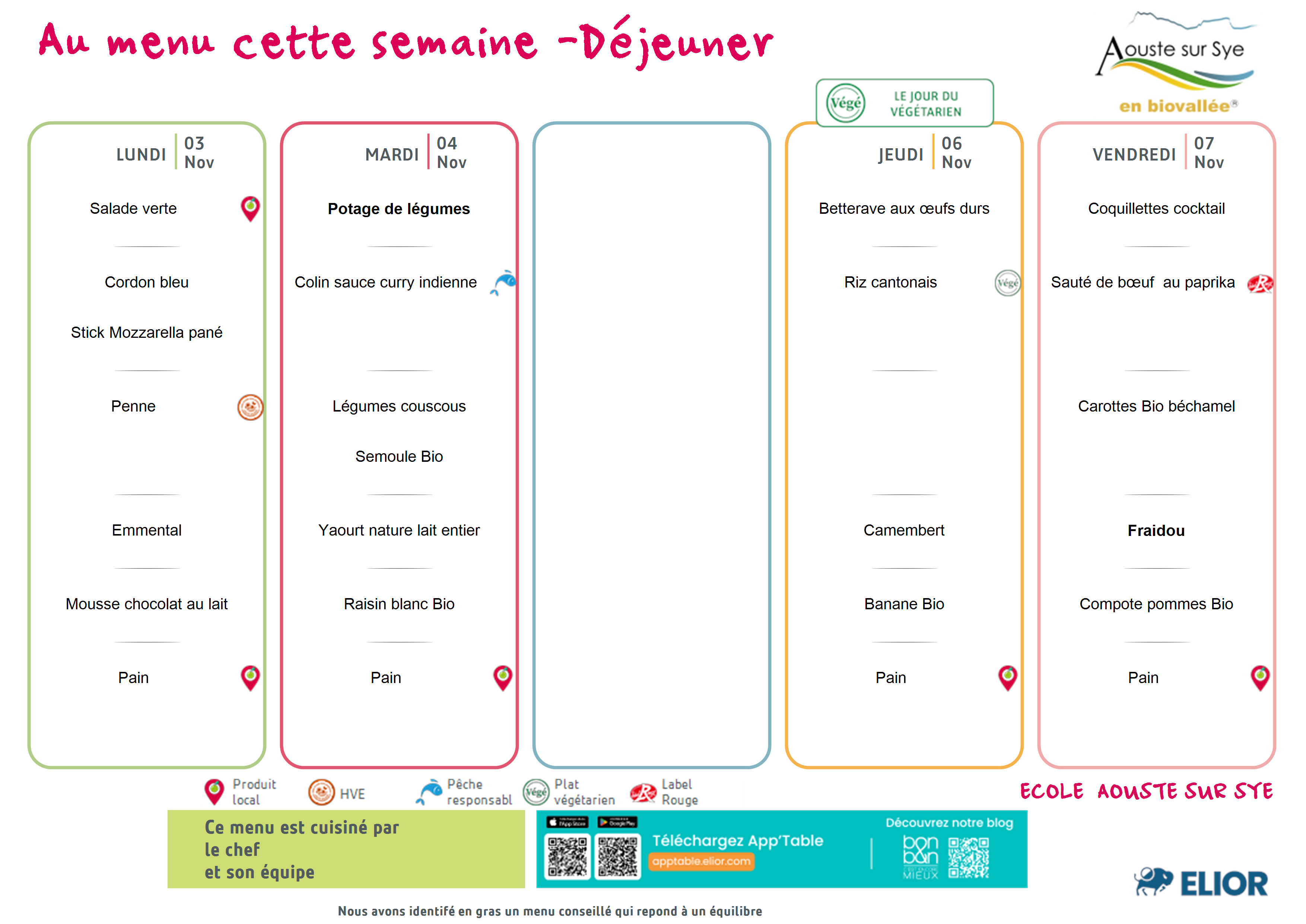 Les menus se trouvent sur le site e-ticket, sont affichés devant les écoles et sont en document joint ci-dessous.